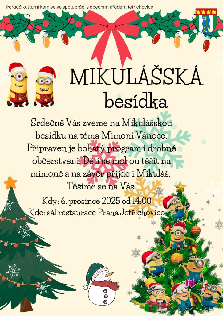 Zveme Vás na Mikulášskou besídku na téma Mimoní Vánoce, která se koná 6. prosince 2025 od 14:00 v sále restaurace Praha v Jetřichovicích. Připraven je bohatý program, který zpříjemní odpoledne, a drobné občerstvení. Mladí lidé se mohou těšit na mimoně a na závěr akce přijde také Mikuláš. Těšíme se n